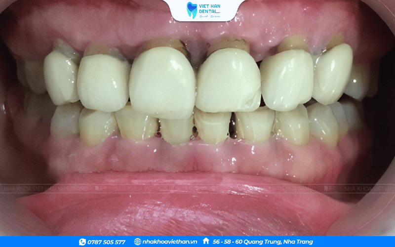 Sau một thời gian sử dụng, phần kim loại bên trong có thể bị oxy hóa khi tiếp xúc với môi trường khoang miệng như nước bọt, thức ăn… Tình trạng này dẫn đến viền nướu bị thâm đen, đặc biệt dễ nhận thấy ở vùng răng cửa, gây mất thẩm mỹ rõ rệt.
